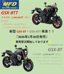 新型DR-Z4S・SM、ハヤブサ、GSX-S1000GT、KATANA、GSX-8S、GSX-8R入荷してます!詳しくは店舗までお問い合わせください!